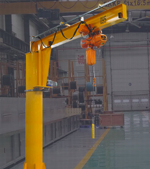 懸臂起重機的基本機構由柱、旋轉臂旋轉驅動裝置和主機葫蘆組成,柱的下端用地腳螺栓固定在混凝土的基礎上,用擺線針輪減速裝置驅動懸臂旋轉,電動葫蘆在懸臂上左右直線運轉,提升重物。起重機的旋臂為空心鋼結構,重量輕,跨度大,重量大,經濟耐用。內置行走機構采用帶滾動軸承的特殊工程塑料行走輪,摩擦小,行走輕的結構尺寸小,特別有利于提高掛鉤行程。